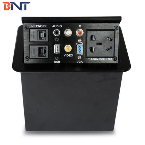 Table pop up socket, press the top of the desktop socket, the mechanical Locking device inside the desktop socket will be released and the connection panel will be opened smoothly by the Pneumatic Support Structure, and use the seams on the panel which user could connect Video, Audio, Network, Telephone, Power and so on. After using the manual socket box, Just press the panel cover, the Mechanical Locking Device inside the desktop socket will lock the box. The locked connection box is flush with the tabletop and all the connections are hidden dexterously. The neat & elegant topside of the box together with the tabletop form an integrated mass